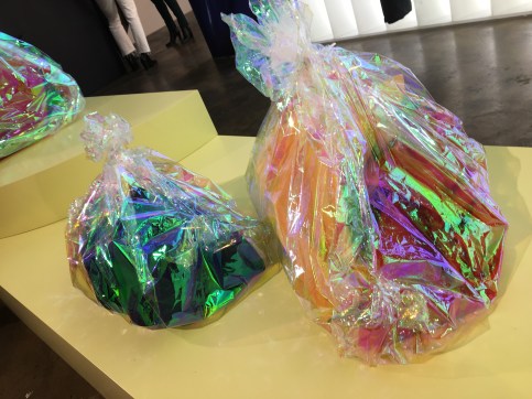 However, Steyaert’s work is in danger of becoming too sexy. If this pairing with luxury fashion continues, it will be difficult to extricate her practice from. While I think this show is the most successful she’s done so far, I think it’s time for a change of direction as well, not building a reliance on one kind of audience, or mode of making and showing; the work is simply too strong. Though the relationship to commerce can be part of how one’s practice connects to the world, other commercial considerations are starting to creep into the work here, notably in references to waste and storage; the rolls of canvas in the series ‘Totems’ describe what happens to ‘unsuccessful’ paintings, rolled up in a corner of the studio; or the trash bag paintings, referencing disposable fashion and landfill as well as being a humorous take on the waste materials or failures of ‘real’ paintings. These trash paintings are spontaneous, delightful, and have a bit of an edge as they play with an underside of beauty and glamour; a transformation from waste into statement. These two series add a depth to the work, a subtle edge of dark humour, but it is their spontaneity and simplicity that really elevates them.