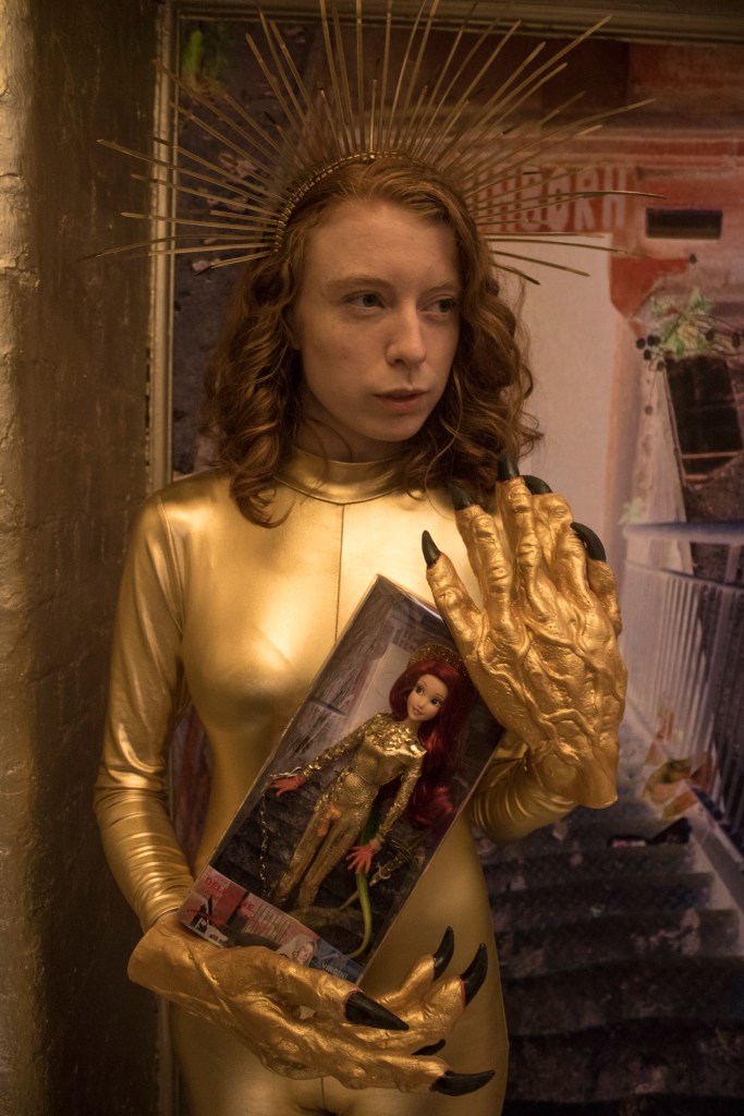 I was unsure what to do after Lisa’s performance when the show was open the following Saturday to Thursday. In the end, which wasn’t totally ideal, I decided to just have the elements of the costume lying around the space, as if Delphyne had momentarily undressed or shed her skin. The presence of the creature could still be felt as the space was so atmospheric and otherworldly, and as I had my painting in a different building (‘The Martyrdom of Delphyne’, oil on canvas, 2019), and I had the Dollphyne sculpture, I felt the character’s physical appearance was well enough represented. I also quite liked the mystery of it, the impenetrable secrets. The installation, even without the performer, still had a sense of its own internal logic: everything in there was there for a reason, and this could be felt even when there was no way of knowing the reasons. This is a quality I really notice and admire a lot in other artists’ work.