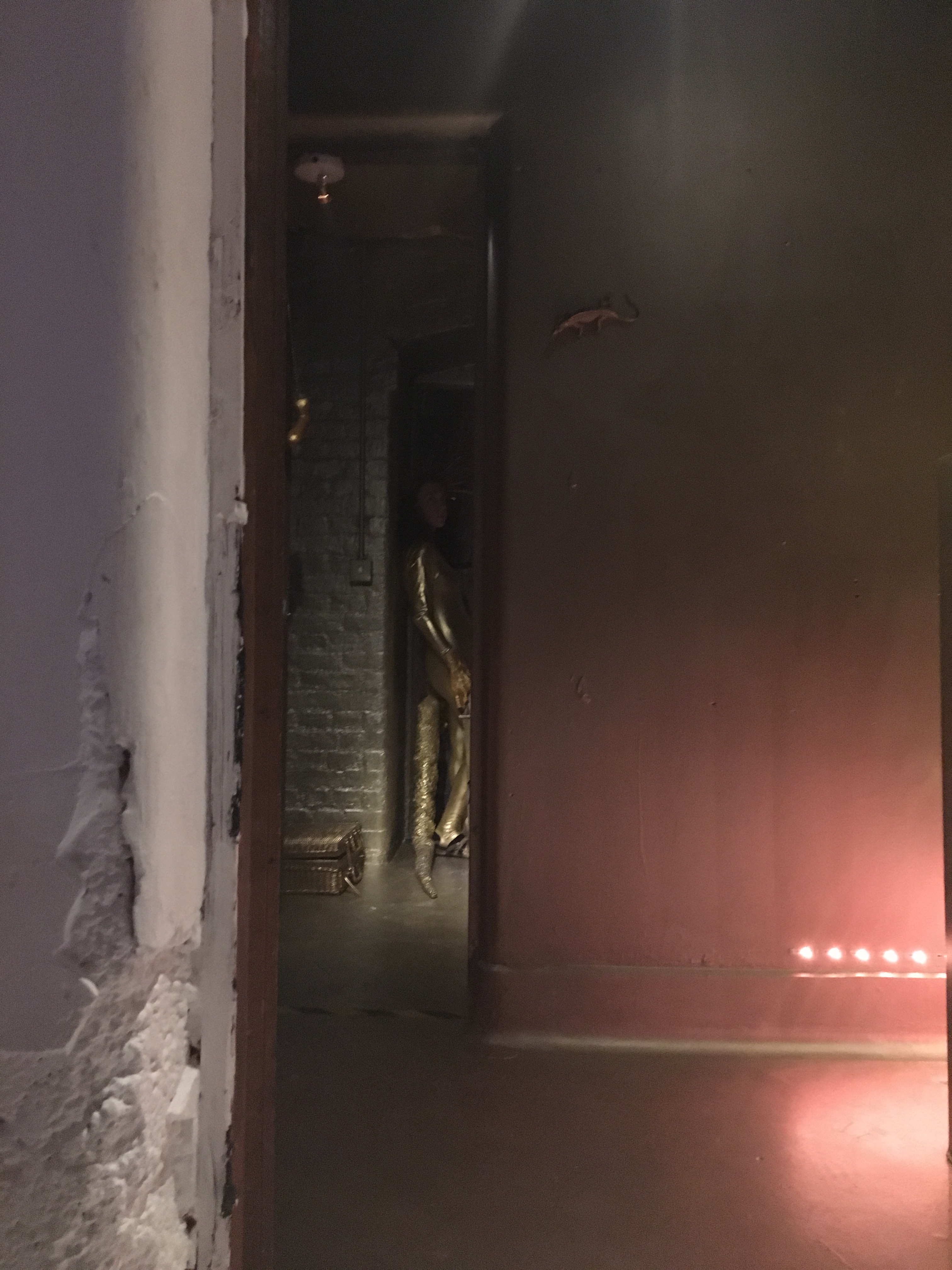 Eventually, after much discussion and after Lisa had tried on the costume in full and seen the cave-space, we decided on a few rules for the content of the performance. This was needed as during the documentation photo shoot Lisa was quite uncomfortable and didn’t seem thrilled about the prospect, and I was actually worried she would pull out. We agreed that she didn’t have to wear the elements of the costume she found too much (i.e. my big gold penis necklace). In terms of the performance, we decided that Lisa would not acknowledge any visitors, ignoring them, as if they existed in another dimension. If they asked her a direct question though, she could respond. Otherwise she was to move slowly about the space, play with her tail, her sword, other items, pose, look bored, daydream. The idea was that the visitor was stumbling upon a moment in Delphyne’s life, acting out in real time, and she spent her life waiting, guarding, anticipating. So that’s what Lisa did, looking rather sulky about it.