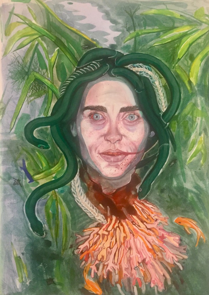 So, this discussion is prompted by a recent return to one of my favourite subjects: the severed head. Above you can see firstly ‘Sea Creatures 6’, the lockdown watercolour from autumn 2020 that reignited my fascination in decapitation, and below some of my paintings from 2015 of some other heads, which still, more subtly, have origins in my interpretation of the Medusa/Gorgon Sisters narrative.
