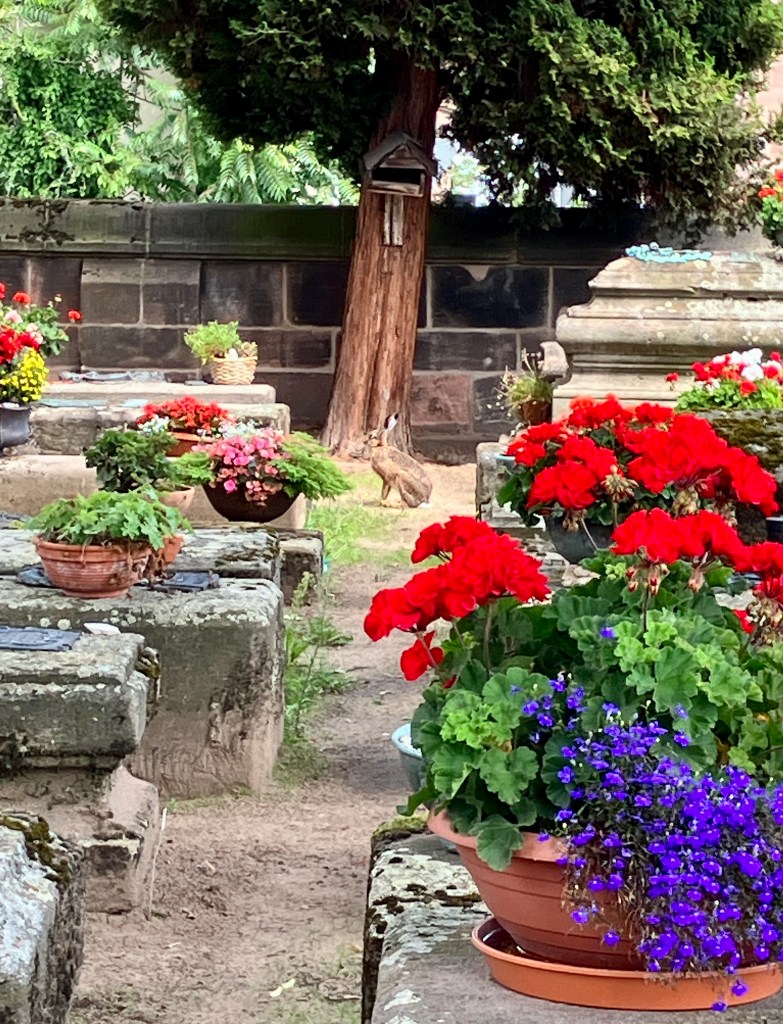 So, before leaving Nuremberg and heading on to Schwandorf by train, I made a little pilgrimage to see the resting place of old Albrecht, one of the all-time greats, prince of the Northern Renaissance. Built outside the city walls in the 13th century but these days very much in the heart of the modern city of Nuremberg, this graveyard was stylistically unique; flower-filled and perfectly maintained with gardeners in waistcoats patrolling the aisles. Laid out in a grid, there were lines and lines of centuries-old tombstones leading towards the small red church at the far side, so closely packed I had to abandon my heavy suitcase by the path, in order to achieve the agility required to inspect the German names in gothic lettering, looking for Dürer. It took me quite a while to find the right gravestone, as all the tombs were variations on the same theme of stone, bright flowers and timeworn metal plaques of intricate text.
