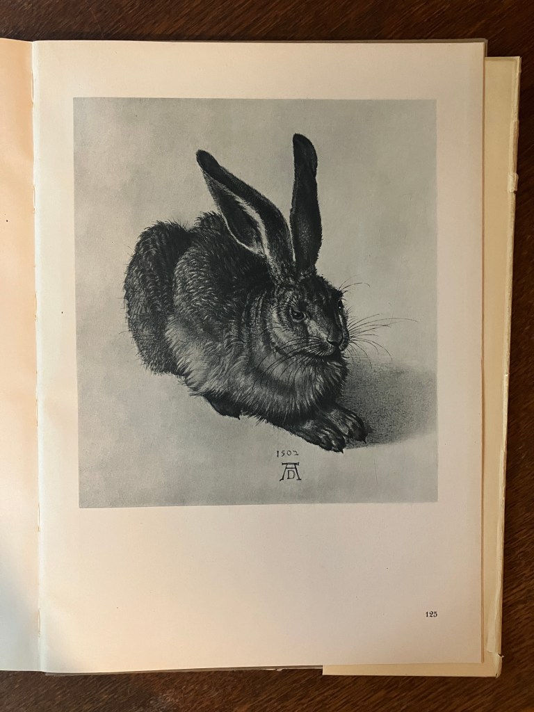 Quite hot and overwhelmed, I then sat down for a while and considered the apparition of the hare. I felt like something had happened that other people would perhaps call a spiritual experience; it was a nice feeling but also decidedly uncanny, as the artistic legacy of Dürer is almost inseparable from the image of a hare. Dürer’s hare is one of the most iconic works in the history of Western art, a deceptively simple study of watercolour and gouache on paper. Layers and layers of soft colour and scratchy line, suggestion of nerves and muscle underneath the skin, and above the skin the complex fur, contrasting textures lying in different directions, a masterpiece of minute observation and skill; no one is really sure how he managed it. No matter the depth of detail, however, the hare never loses its twitching liveliness, remaining a sharp and sinewy malevolent presence, with the shadowy eyes of an eldritch creature. Dürer was 30 when he painted his hare, the age I just turned this year.