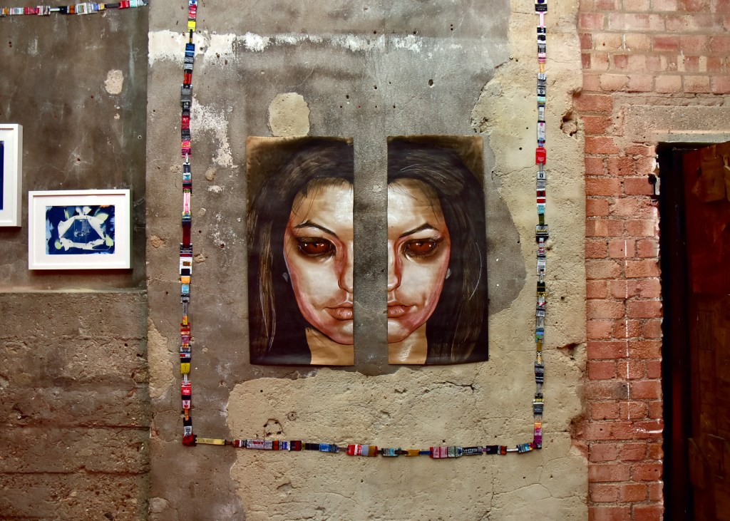 The four new drawings I made I was satisfied with. The last of them, the large face with scabby cat’s eyes, is an image I have painted, made collages of and drawn many, many times before; it has never come out the way I really want it to; the final result never seems to have the raw power of the gaze that I feel it could achieve. So this large drawing, one of the biggest drawings I’ve ever undertaken at 83.5 cm by 75cm, was made even more challenging by depicting an almost impossible subject. It came to the venue in one piece; I had already decided before installing that I would cut the face clean in half. It worked a lot better after that; the disruption of the space between the two halves and the ferocity of the eyes staring while the viewer’s brain tried to bring the face back together in the mind’s eye, while being disrupted by the textured brick and concrete walls, seemed to increase the work’s intensity as well as connecting it to the wider environs.