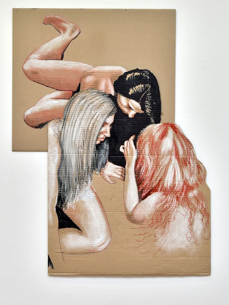 I chose to destroy the drawings I made in Germany (aside from one made on cardboard, which I left behind in Bavaria); I felt they were the start of something interesting, but they were not fully realised yet. Indeed, they represent my first ever solo fully committed drawing project; drawings as final outcome. I felt I could do better, with the techniques I’d played with in the residency studio. There was something about the red-brown, dark brown and creamy whites that felt very traditional, Old Master-ish; the tonal contrasts and contrasts between tight detail and rough gesture that seemed to give them some energy; I also enjoyed the sweatiness or glossiness of the skin, built up through tone with chalk pencil and oil pastel on top of the pencil and pen.