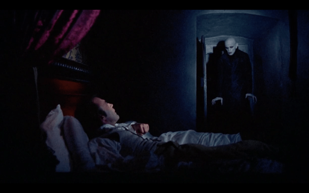 It’s been a while since we’ve discussed vampires here, and as the nights are now drawing in and the leaves are turning their autumnal colours, I wanted to go back to my roots and discuss my favourite subject. Back in January of this year, on another cold, dark, wet evening, I saw the highly anticipated Nosferatu by Robert Eggers; I then rewatched Werner Herzog’s 1979 Nosferatu the Vampyre, and it is this double-bill I will now compare and contrast. I am, however, aware that Eggers’ Nosferatu is not necessarily a straightforward adaptation or remake of Herzog’s film; it of course takes within its scope the whole of the vampire cinematic tradition, since the novel Dracula first appeared in 1897. However, I think this pairing especially illuminates the current cinematic understanding or usage of the ‘re-make’: a ‘making-perfect’ or ‘making-full’ of a poetic or lyrical earlier narrative tradition; an eradication of gaps, shadows, nuance.